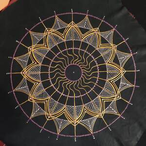 Du coté de la peinture sur cuir : 3 épaisseurs de tissus dont une imperméable pour le coté peau du tambour